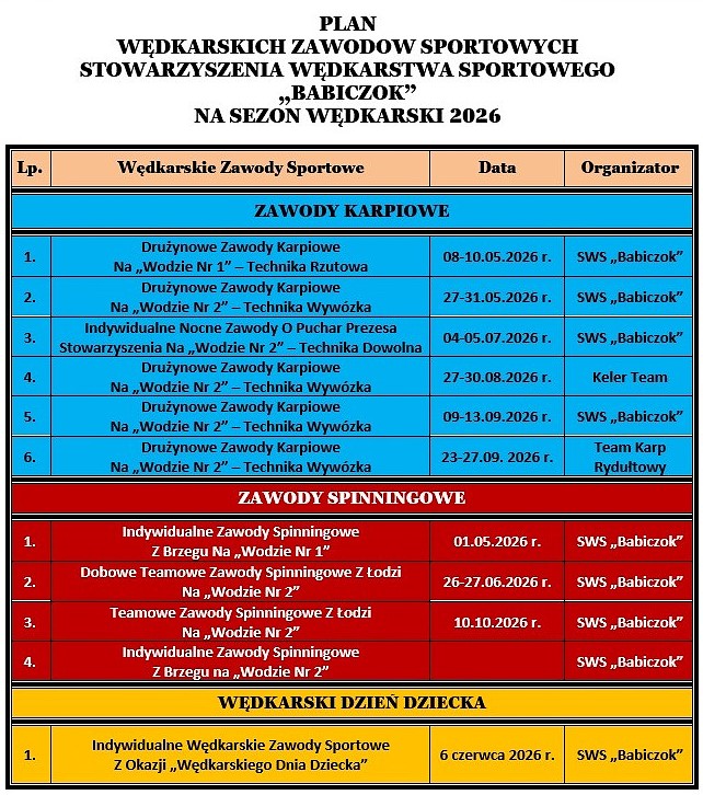 09-13.09 Drużynowe zawody karpiowe „jesień 2026” wywózka. stowarzyszenie Babiczok. łowisko Babiczok 2.